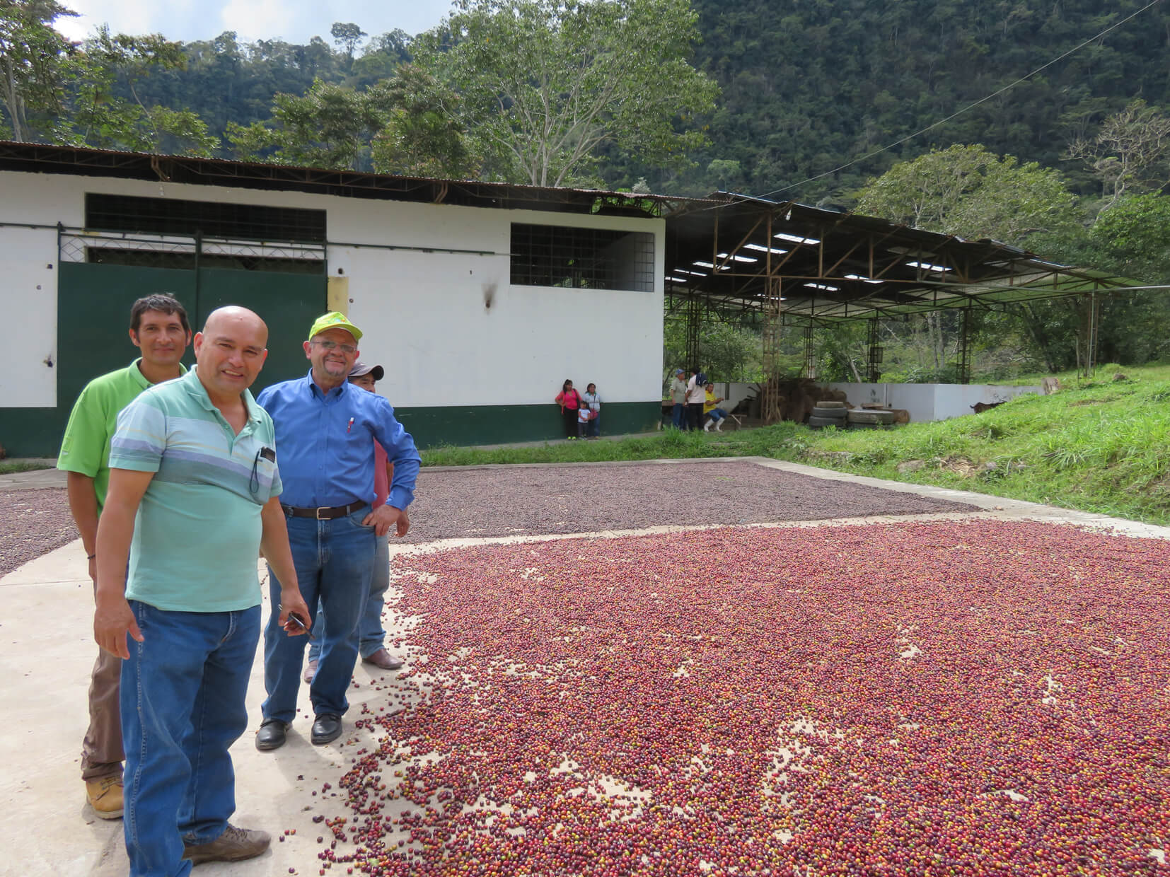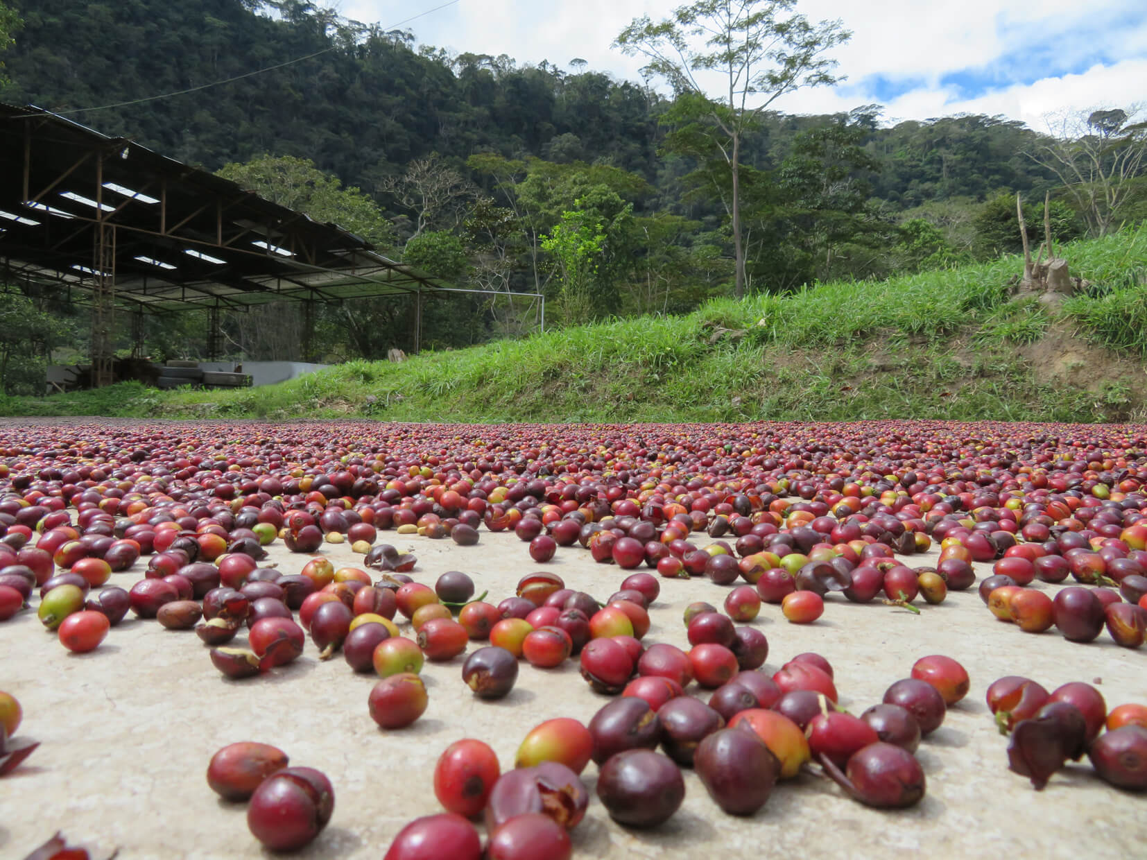 Les cerises de cafés, cueillies à maturité entre 1400 et 1700 m d’altitude, sont séchées sur une dalle pendant environ 3 semaines : pas de consommation d’eau pour laver les grains.